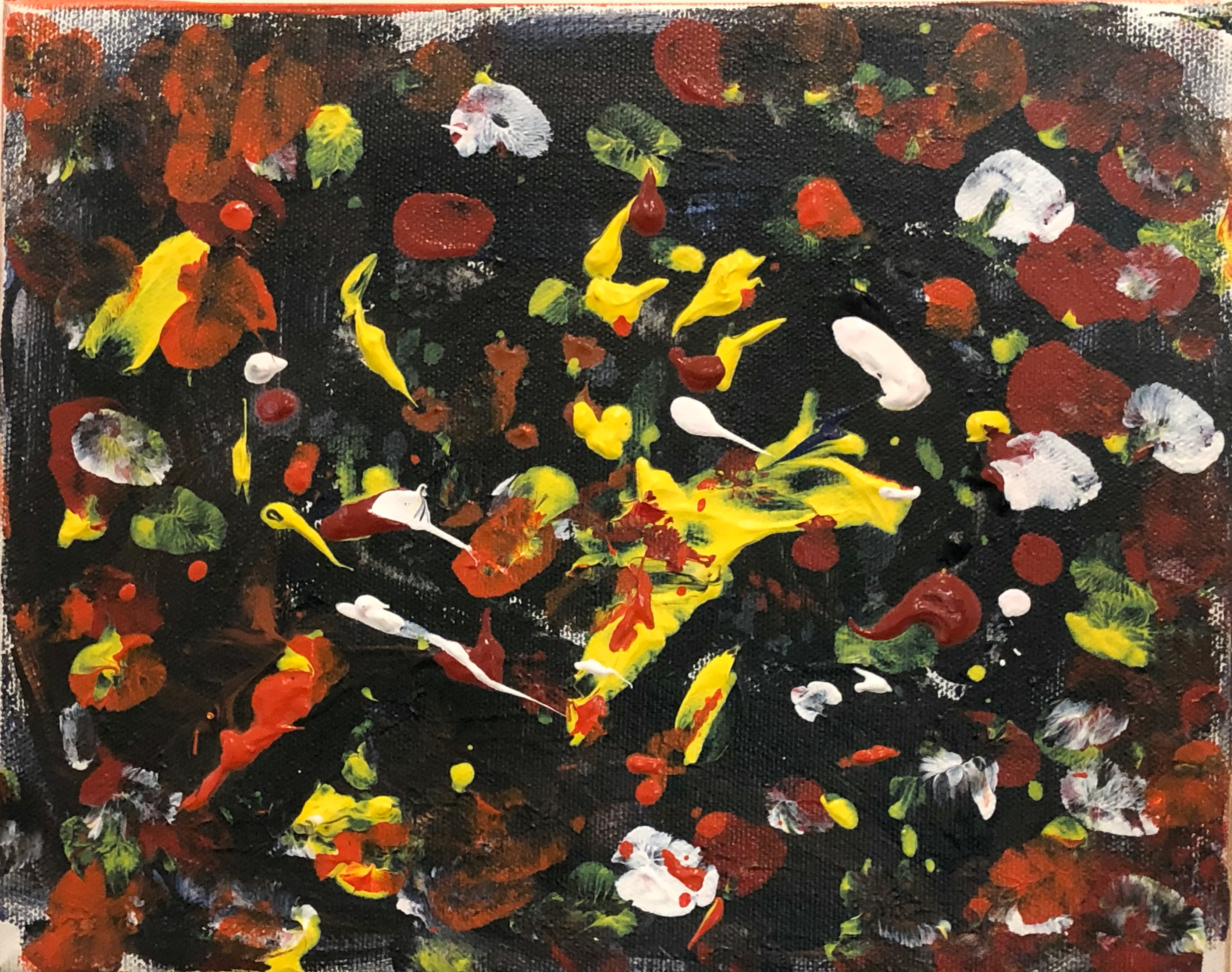 This came about because I wanted to try to do another abstract expressionism painting like my older one "Green Hill", however my paint seemed to be to "stiff" too stiff to do it like the originalOh Noes . So I mangled the stiff paint with my hands (yes it was messy) but eventually I got it sort of like it of course had different colors than the first and I liked ultimately how it turned out and it remined me of fast food and thus I named it "Fast food night".