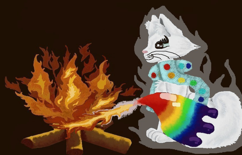 One chilly fall night; Artis, with her colorful cat collar transformed into a seasonal stylish fall scarf and, decides to practice her fire making skills to be a warm satisfied kitty for the night = n = (the temperature most cats like to be). But this magical cat ,that is art itself, does not rub sticks or rocks together to get a roaring blaze, not even a match or a torch. No, instead Artis uses her magical art powers to animate fire into artistic existence (yes Artis also can create visual images into reality with her magical paintbrush tail). Thus she successfully brings another roaring fire into existence for another cozy night.