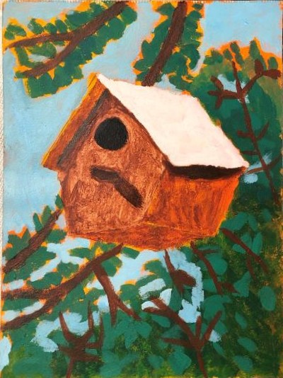 This was a painting that’s as started in an art class (ran by a personal friend that was a famous artists in my town.) She told us we were going to draw a birdhouse in a tree to work on our perception so we did it and this is how mine turned out: very nice and interesting 🧐 .