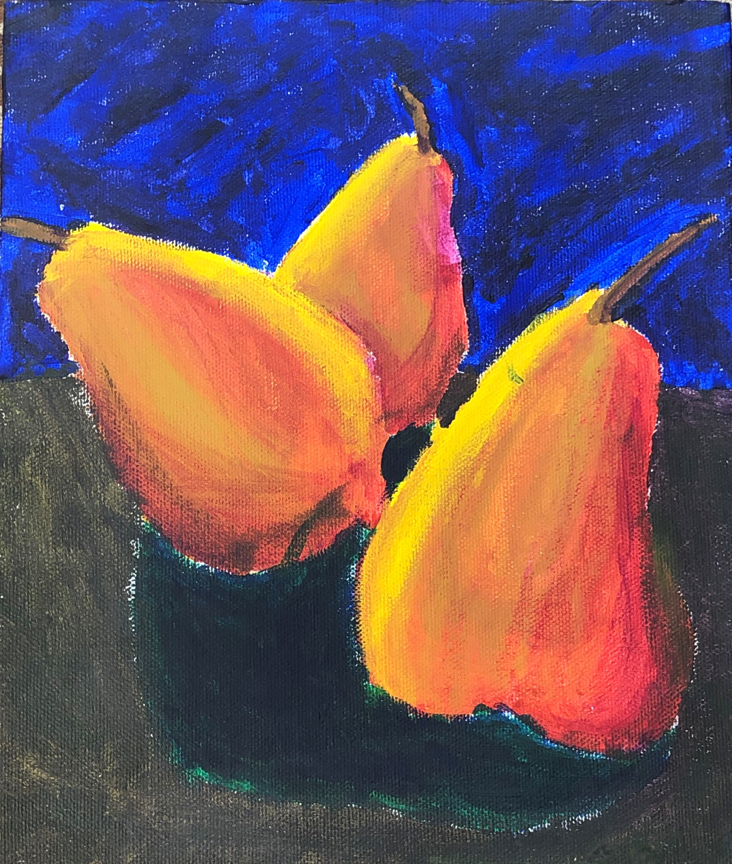 This was done as a project in art class, the teacher (a church friend I personally know who happens to be a regionly famous artist) instructed us to draw pears I think🤔. She helped me to make this( I think by helping me to chose the colors) and it turned out well this is really one of my favorite paintings.
