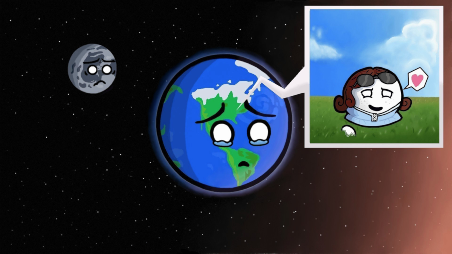 After seeing that Earth has been through soo much pain, and heartache (or rather 'coreache') from his surface, I feel so terrible for the planet's pain and feel really guilty for what 'earthlings' do to cause that pain and agony. I know it sounds crazy to any Earthling, but I feel like I need to try to talk to him: Earth needs comfort; especially from an Earthling on his surface. So, I feel like I need do 'the right thing' and try to talk to him, letting the planet know he's not alone and at least one of his Earthlings really cares about him and feels his pain. So, I venture out to a nearby meadow and sit on the grass and try to talk to Earth from his surface patting his surface in comfort as I tell him my apology. Earth happens to hear me speaking from space and begins to get emotional in unbelief that an Earthling actually cares for him let alone is trying to speak to him and comfort him, while the Moon sees Earth getting so emotional and wonders if he’s about to have another breakdown again.