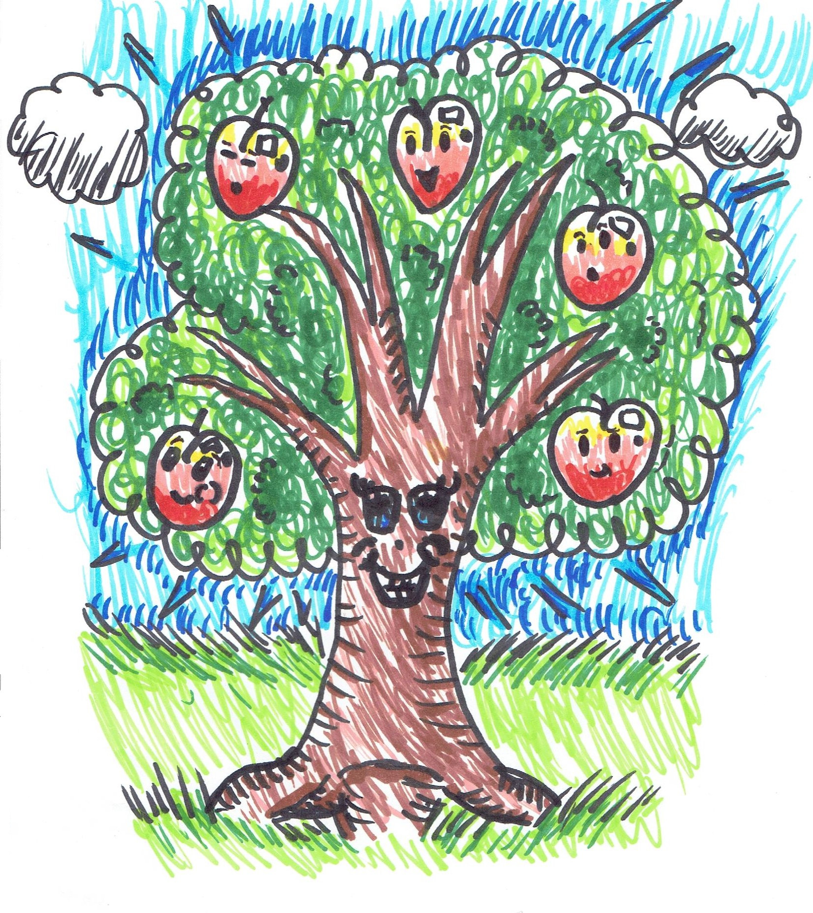 I thought that was the most creative and best idea ever for a tree, I had it perfectly pictured in my mind. So I also decided to go with drawing it how the guest artists did their drawings: Take a piece of Paper and some colored markers and just start drawing. So I drew it from start to finish in one sitting without redoing anything with only markers. It was a challenge for me because I usually do things in sittings and redo a lot of things but nope not this time. Anyways it was going well in the first part but after a while the face of the momma tree began to get a little weird, so here are the results, and it turned out okay...yeah...:| (Blank Stare)
