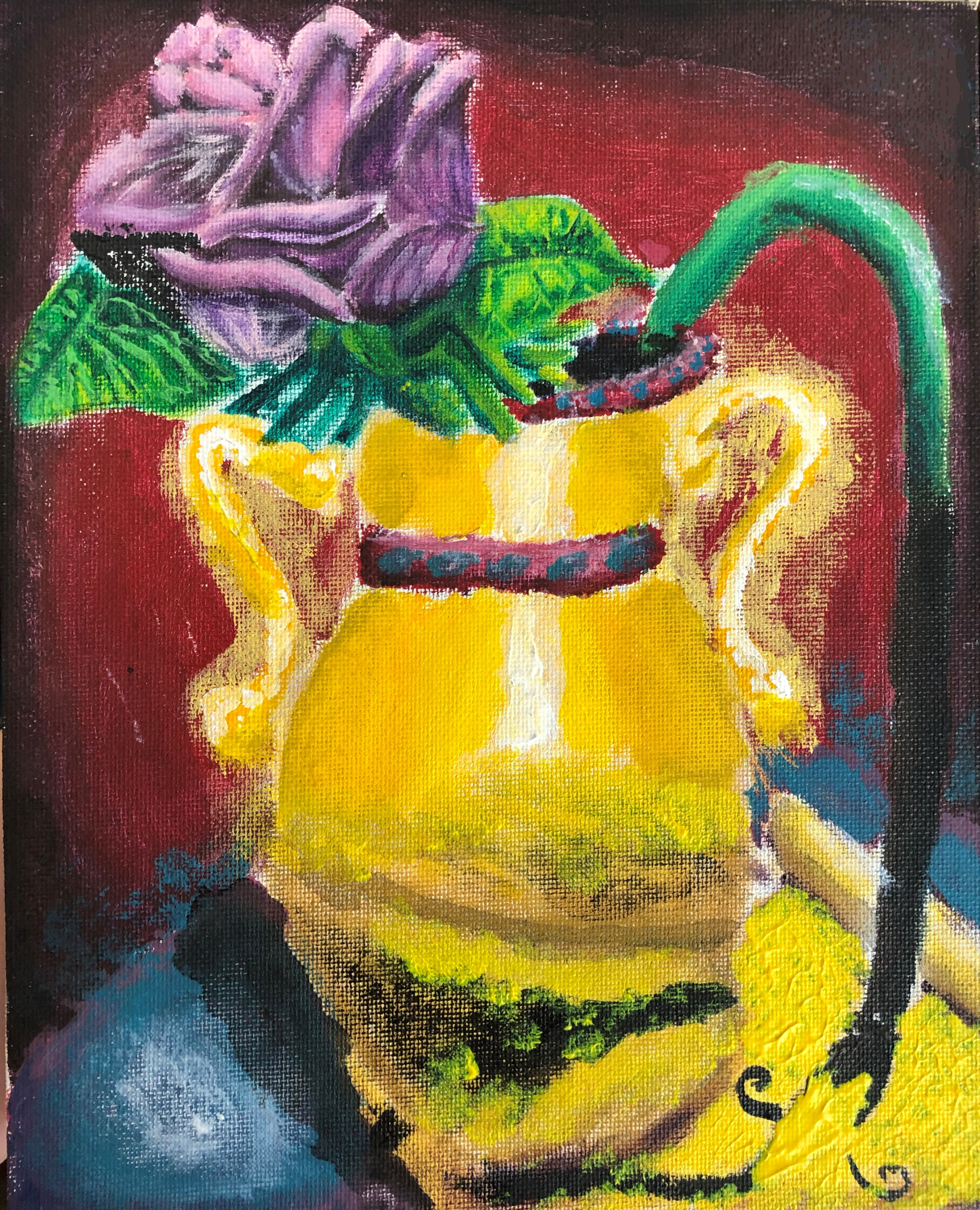 This is one of my first original paintings, it originally began as a still life of a flower than my mom got, but as the painting progressed it became more detailed : it began to symbolize writing/drawing creativity as the pen draws on the paper and creates a vase and flower. And art inspires more creativity symbolized by the flower Turing into the pen