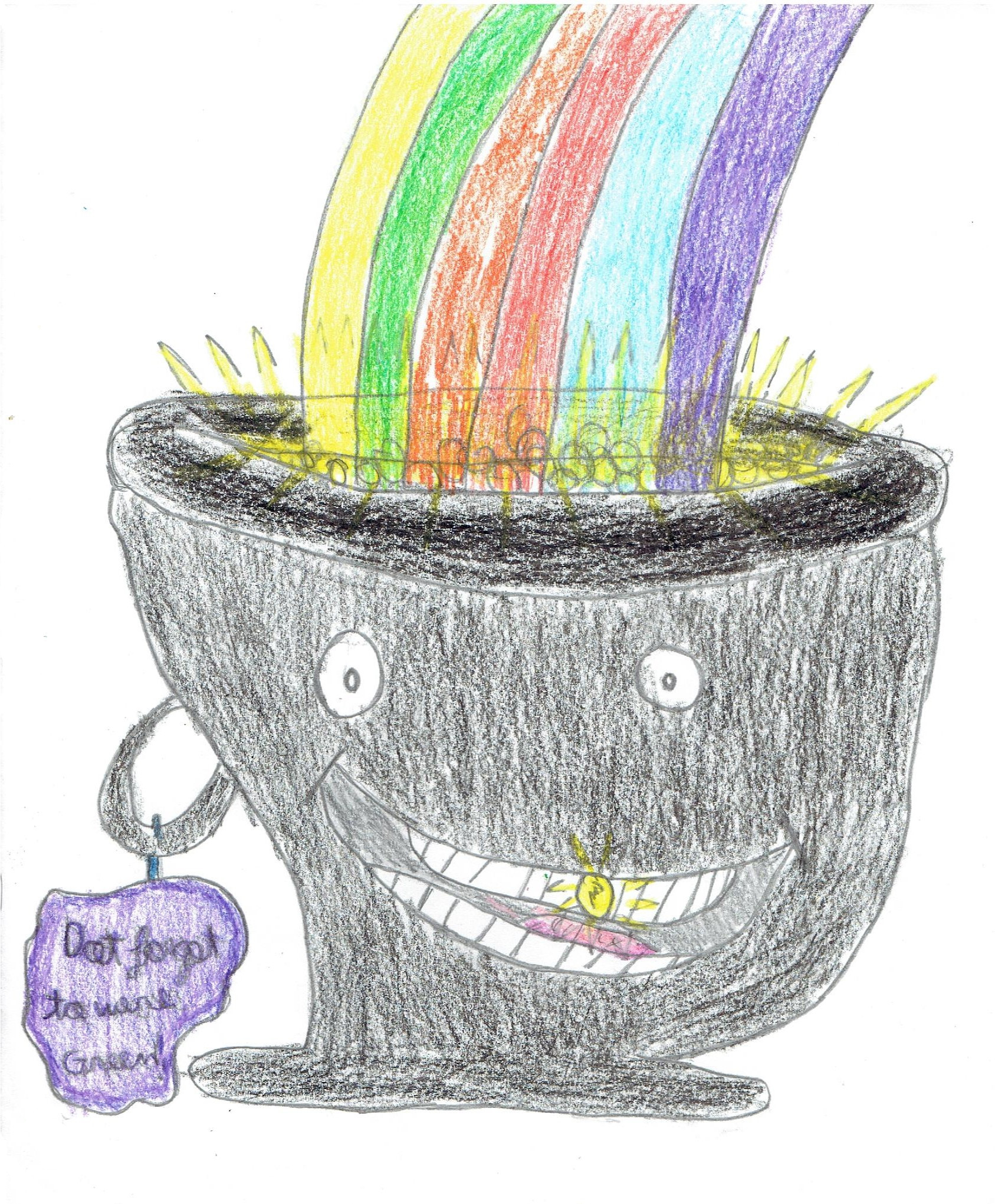 Yeah....well I know this is ugly and pretty hard to look at, but this monstrosity was one of my earliest St Patrick's day inspired works of an Irish Pot of Gold at the end of a Rainbow. However, this is a funnier version (which was to make this pot look like a sort of gangster) that was made to be humorous joke for Saint Patrick's Day for me and my family. However, it turned out to be much creepier than I wanted. Oh well, it's still a little funny to look at despite being badly drawn compared to my other works, it's more about being funny than nicely drawn so …enjoy.