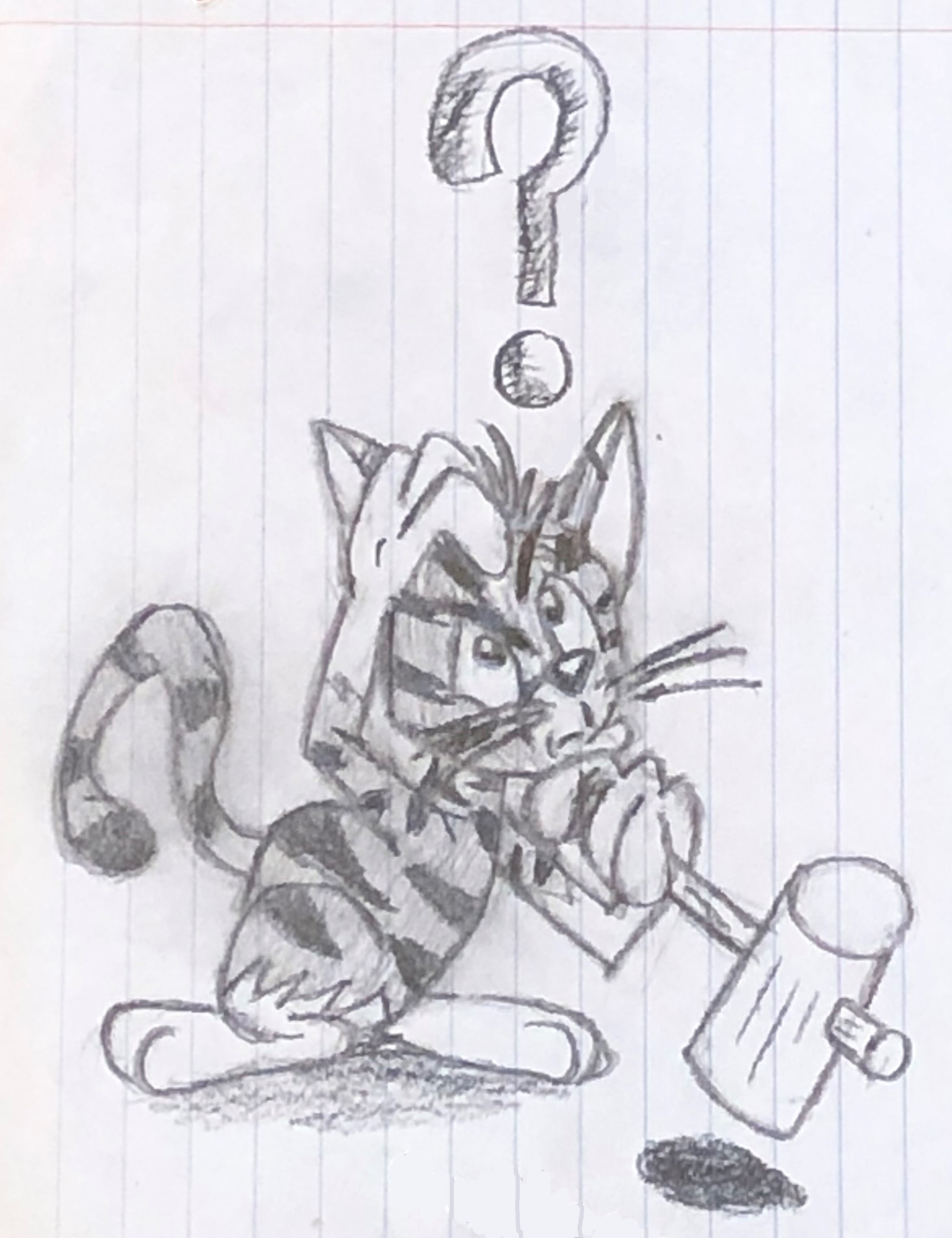 This cartoon cat wielding a mallet look like he is confused about something. Judging by the mallet in his hand; he's after someone, and if I know anything about cartoon cats he's probably after a mouse but if I also know anything else about cartoon cats after mice there pretty unsuccessful and end up getting hurt; often by themselves. This started as a practice of trying to draw a cartoon cat inspired by a cartoon animal book I have.