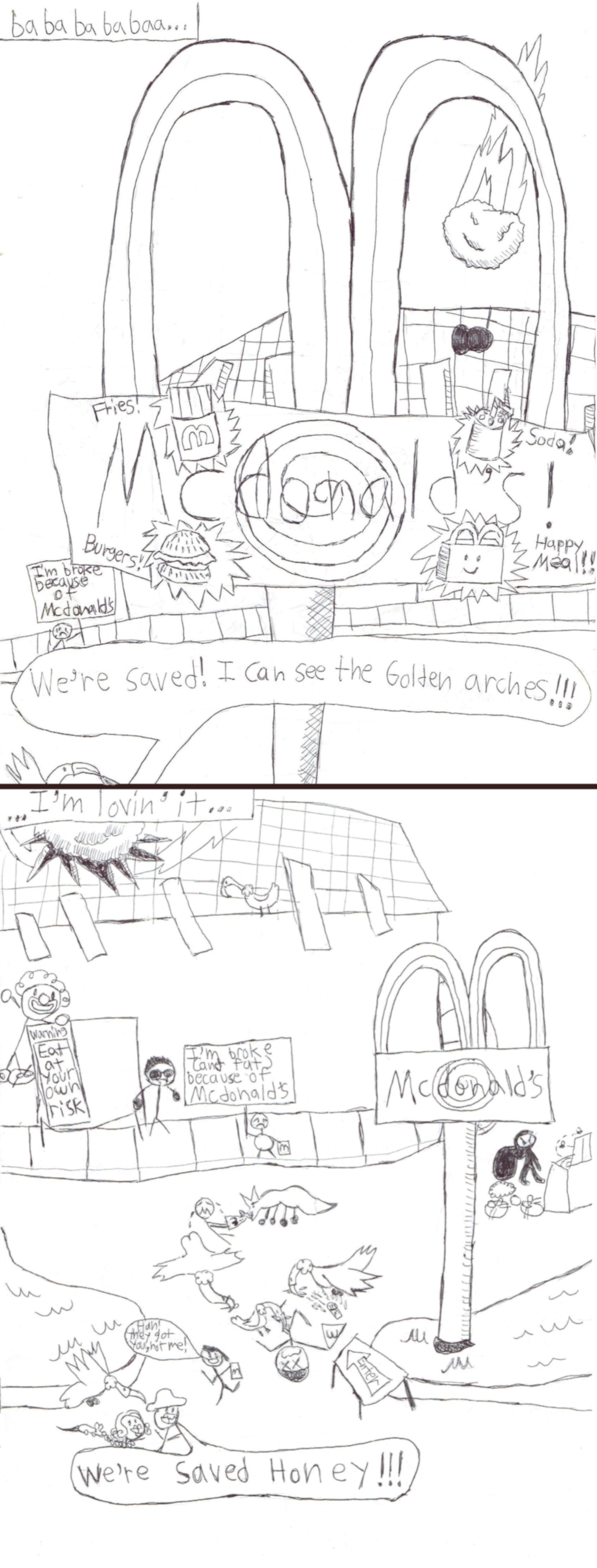 Well,um:| (Blank Stare) ...this is one of my strangest comic I have ever done and it's a little odd but in a funny way (At least to me anyway).This is a satirical comic I did of McDonald's a long time ago, in fact this is one of my oldest comics.The irony is that when I did this I loved McDonald's a lot and really that was all the fast food I ever ate. But I use to make these strange satirical comics about McDonald's just for the fun of it.This is the type of art like "The life of a Bee" that I drew just purely for laughs (so please don't sue me McDonald's INC. Please ). This is my last surviving ones I have found and refurbished.
